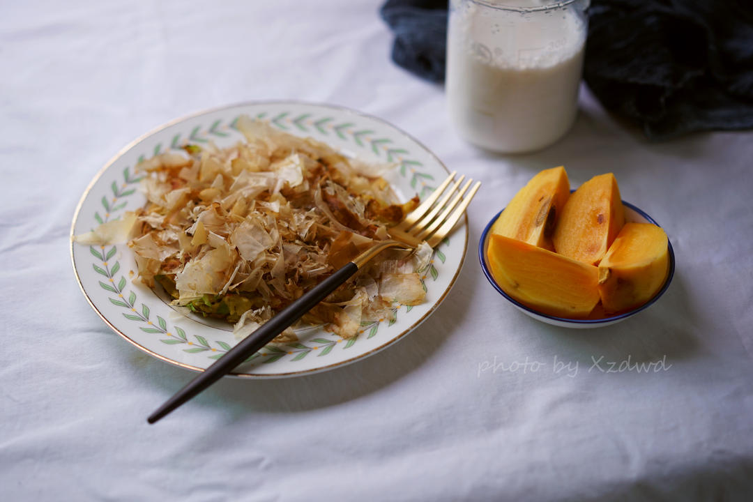 早餐,伪大阪烧,牛奶,脆柿。