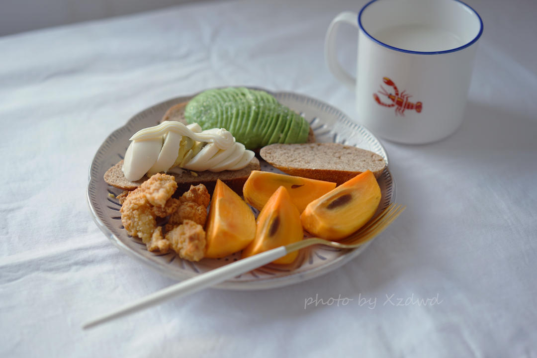 早餐,各种开放式三明治,空气炸锅鸡块,脆柿,牛奶。