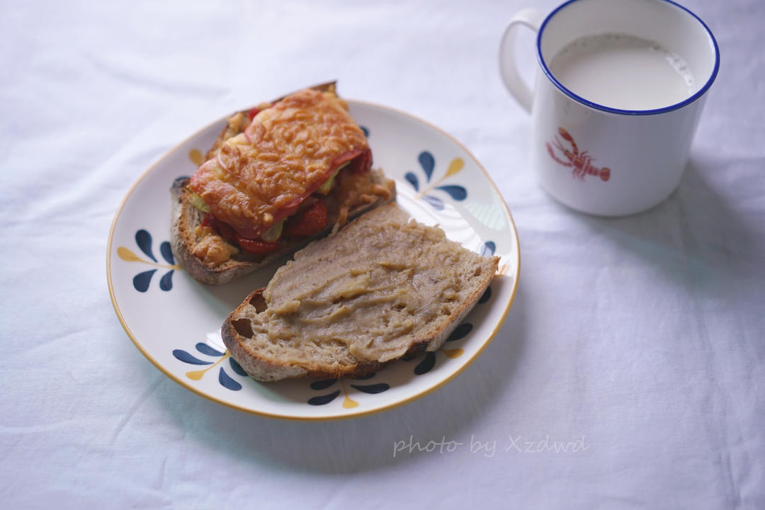 早餐,一片酸面包配彩椒鸡蛋饼,一片配栗子酱,牛奶。