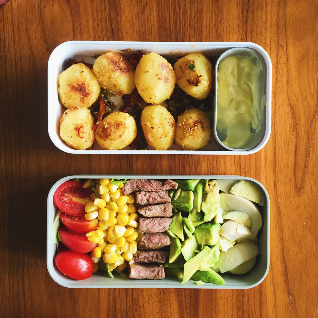 牛排版考伯沙拉以及蒸过了没有办法拍扁的小土豆