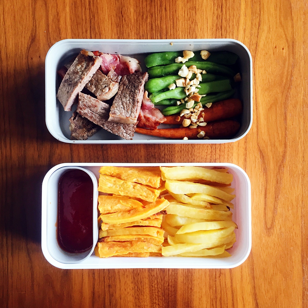 牛排和薯条更配哦,为了减轻昨天吃了比我脸还大的炸鸡排的罪恶感,薯条是烤的