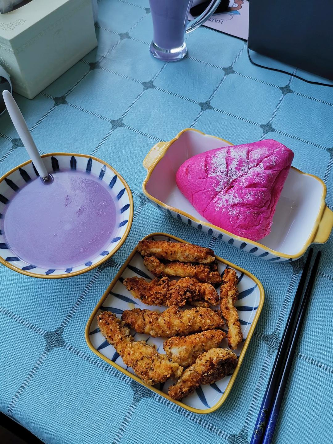 紫薯腰果米糊、火龙果奶酪软欧、孜然鸡柳