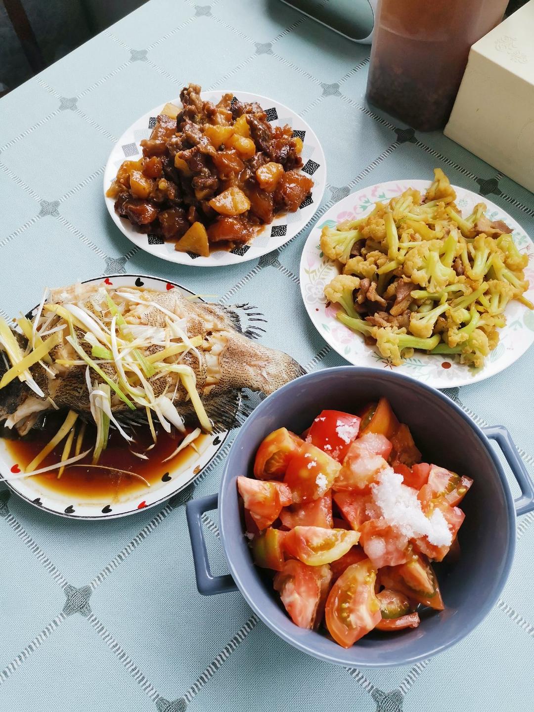 大米饭、土豆烧牛肉、清蒸老虎斑、肉炒菜花、糖拌西红柿