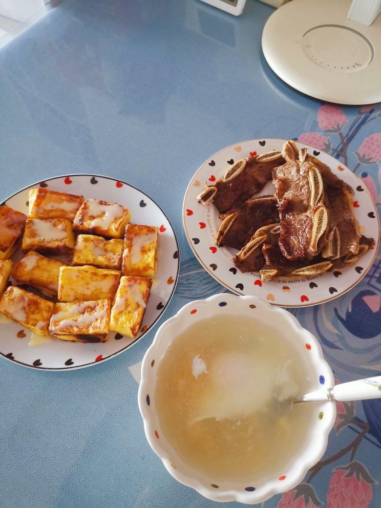 荷包蛋玉米羹、西多士、煎牛仔骨