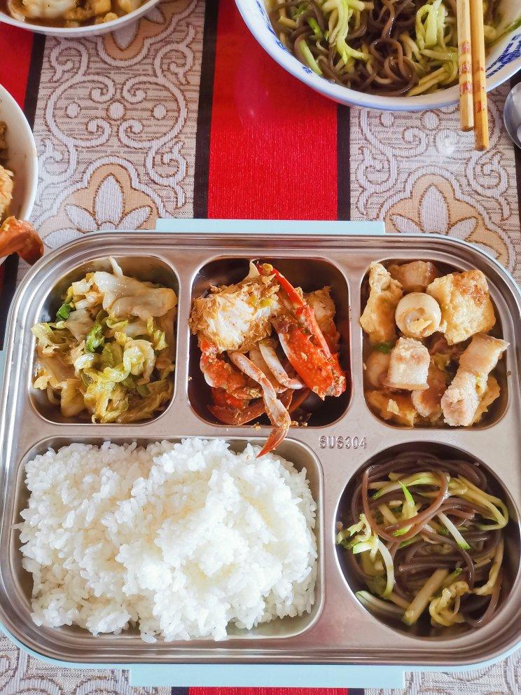 老妈给准备的午饭:大米饭、五花肉炖豆腐鹌鹑蛋、酱飞蟹、炝甘蓝、捞拌蕨根粉 #新长征路上的早...