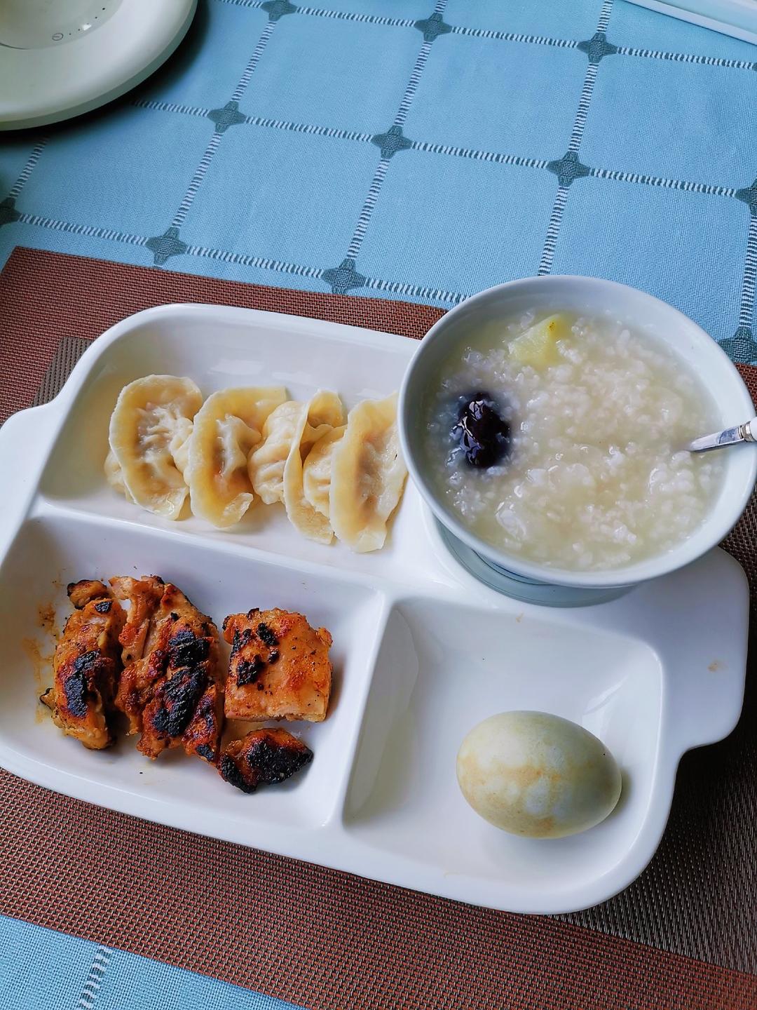 银耳雪梨粥、鲜虾蒸饺、煎鸡腿、海鸭蛋