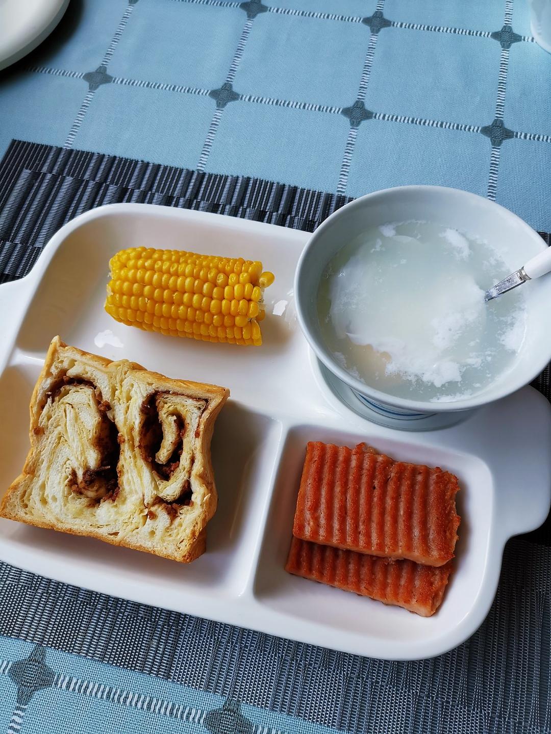 糖水荷包蛋、巧克力扁桃仁吐司片、煎午餐肉、玉米段