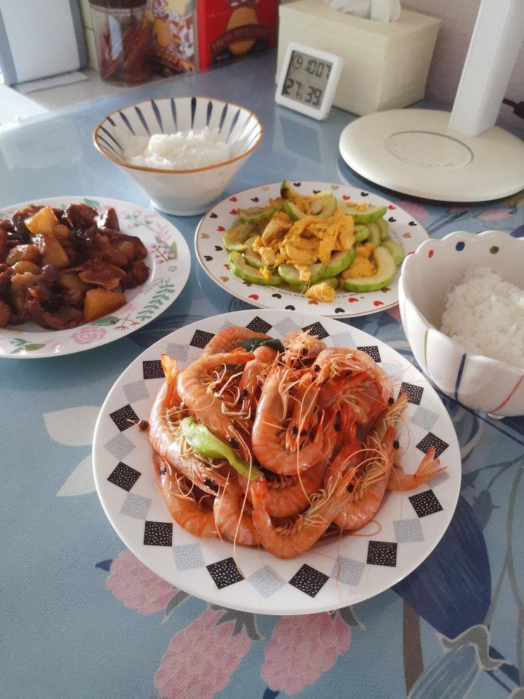 大米饭、筋头巴脑烧土豆、白灼基围虾、角瓜炒鸡蛋