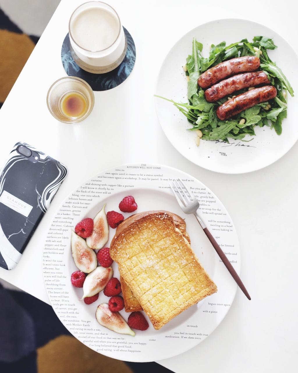 👩🏻🍳砂糖厚片吐司+黑胡椒香肠+草+水果