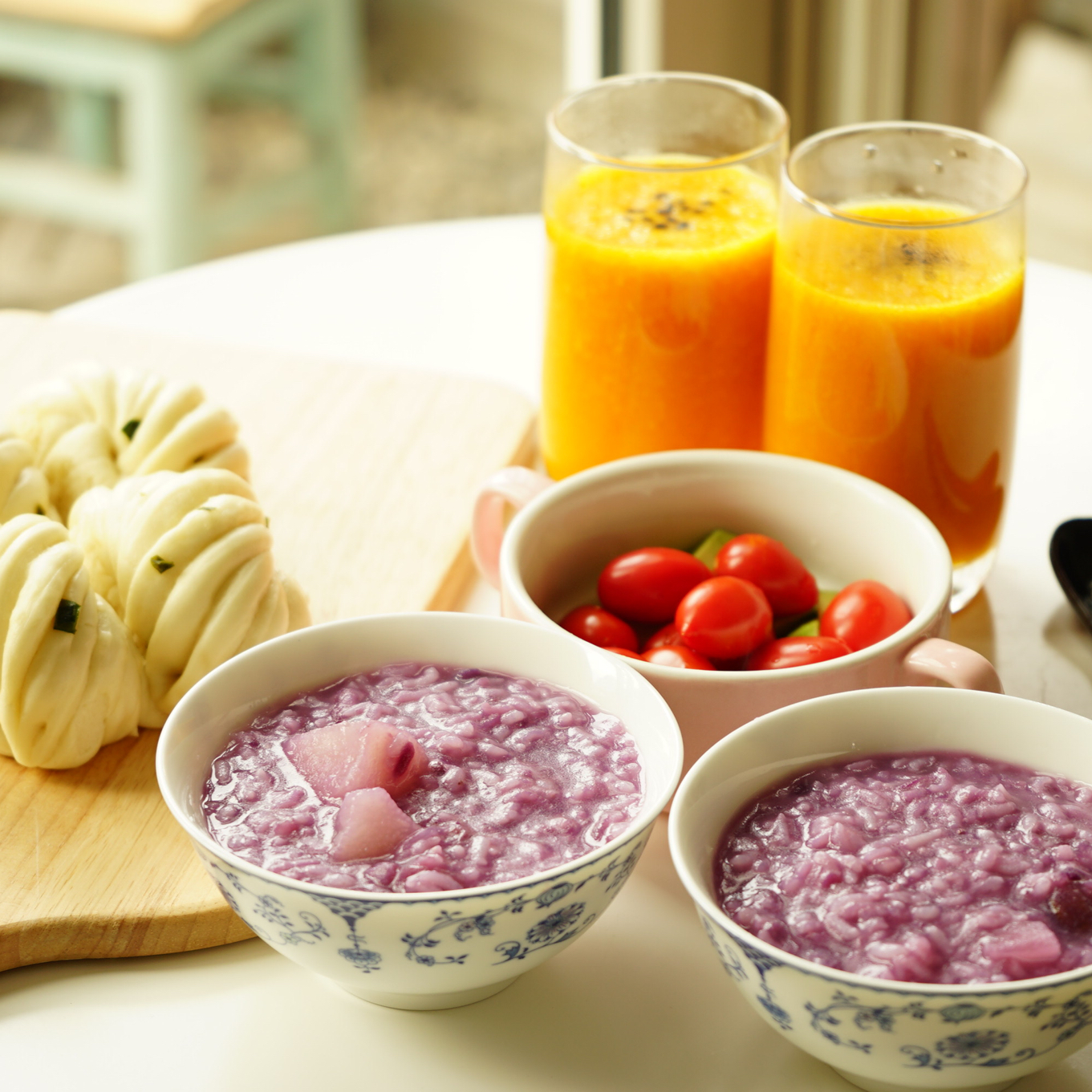 紫薯山药粥~南瓜银耳露~小花卷~小水果~