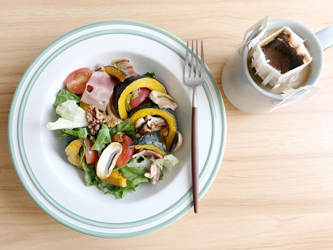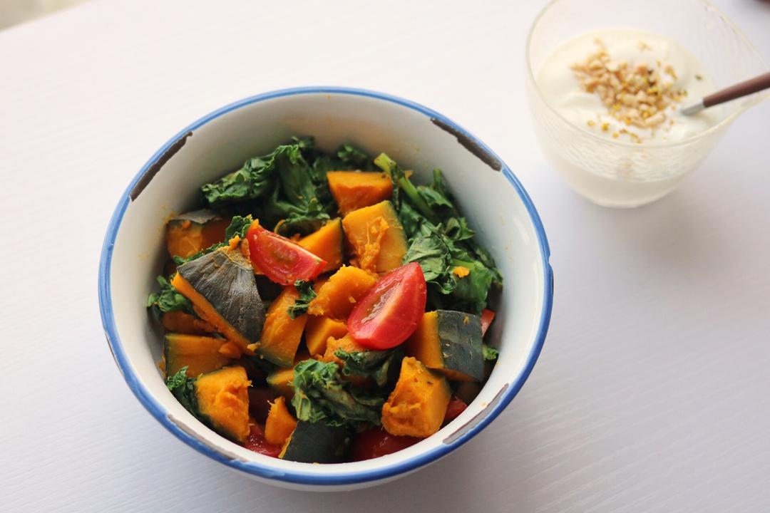 贝贝南瓜+羽衣甘蓝+小番茄+鹰嘴豆~ 还有自制无糖酸奶~