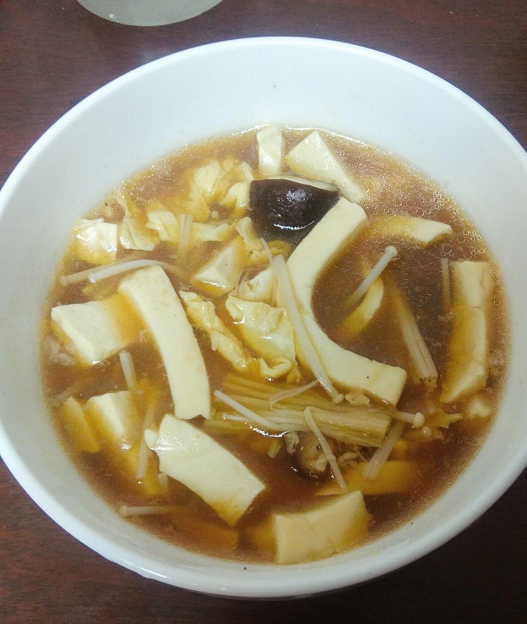 没有加肉,用了鸡蛋,豆腐,金针菇和香菇,很美味!坐着也方便!养生!