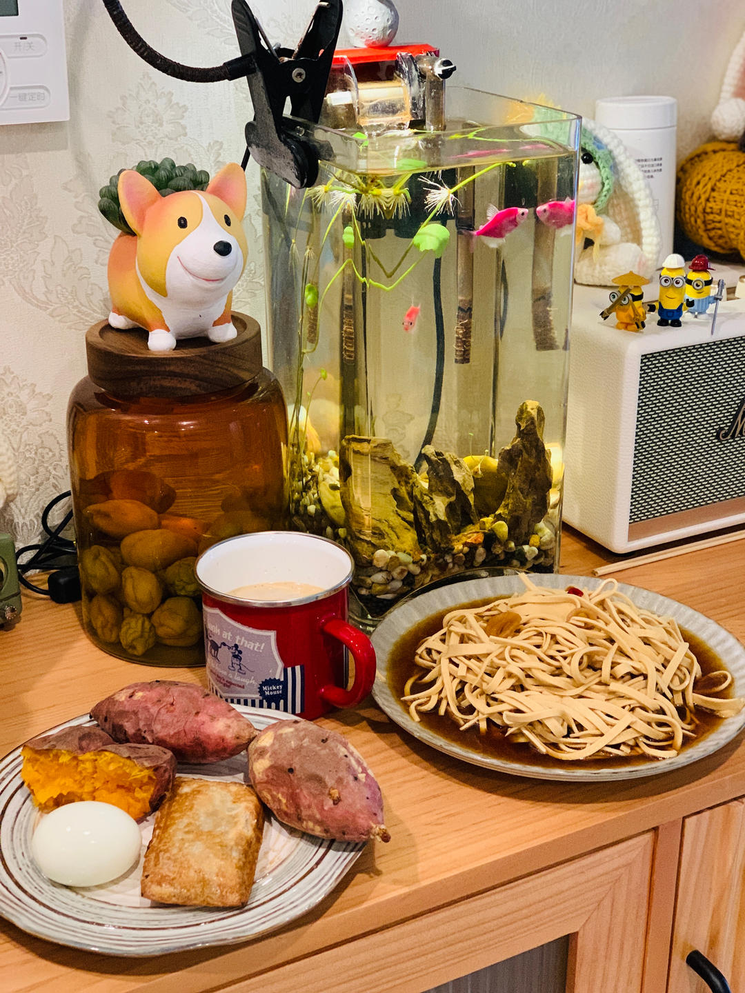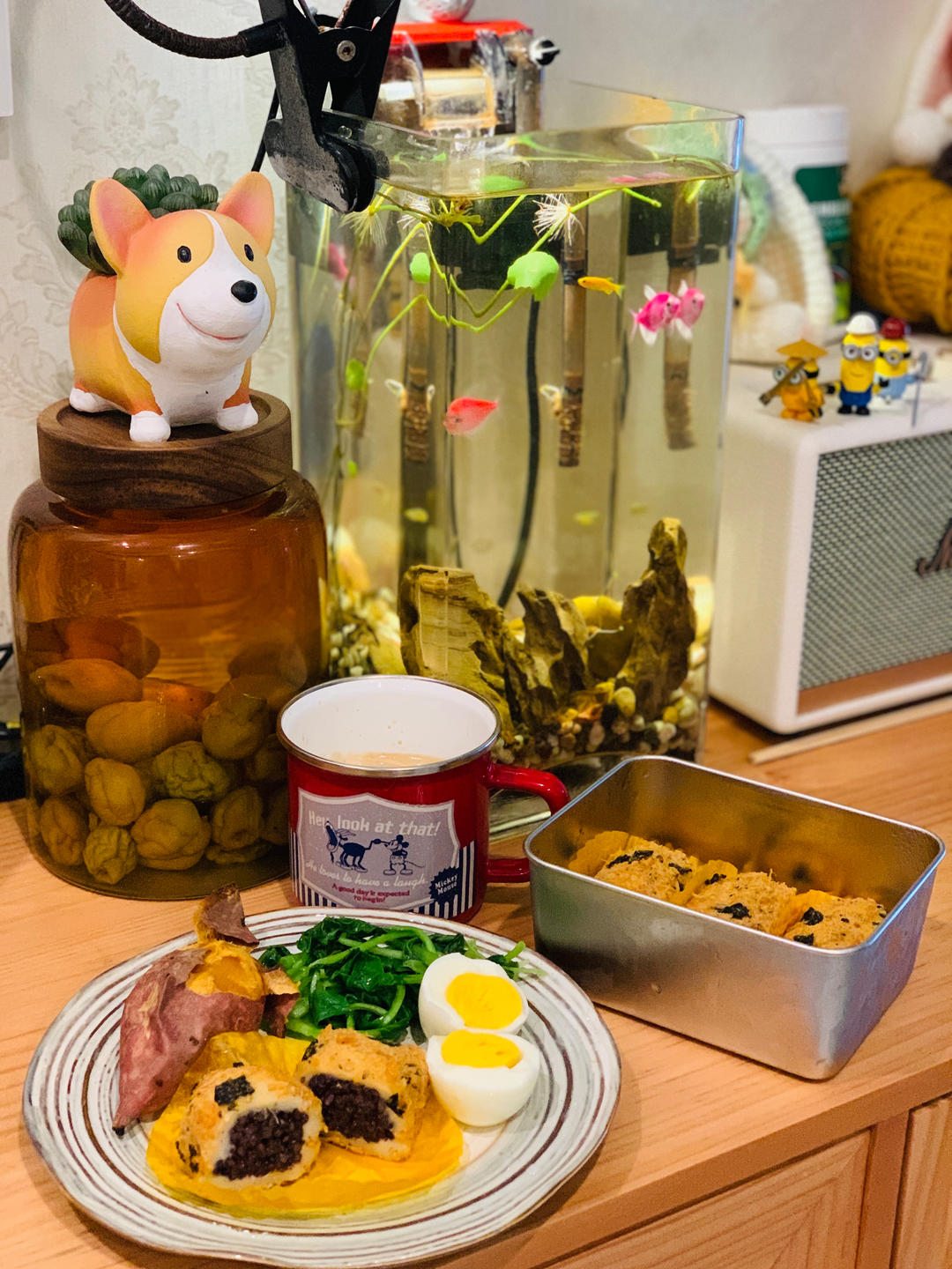 肉松紫米糯米糍,煮鸡蛋,烤红薯,水煮菜,起床把红薯扔进空气炸锅,鸡蛋放入煮蛋器...