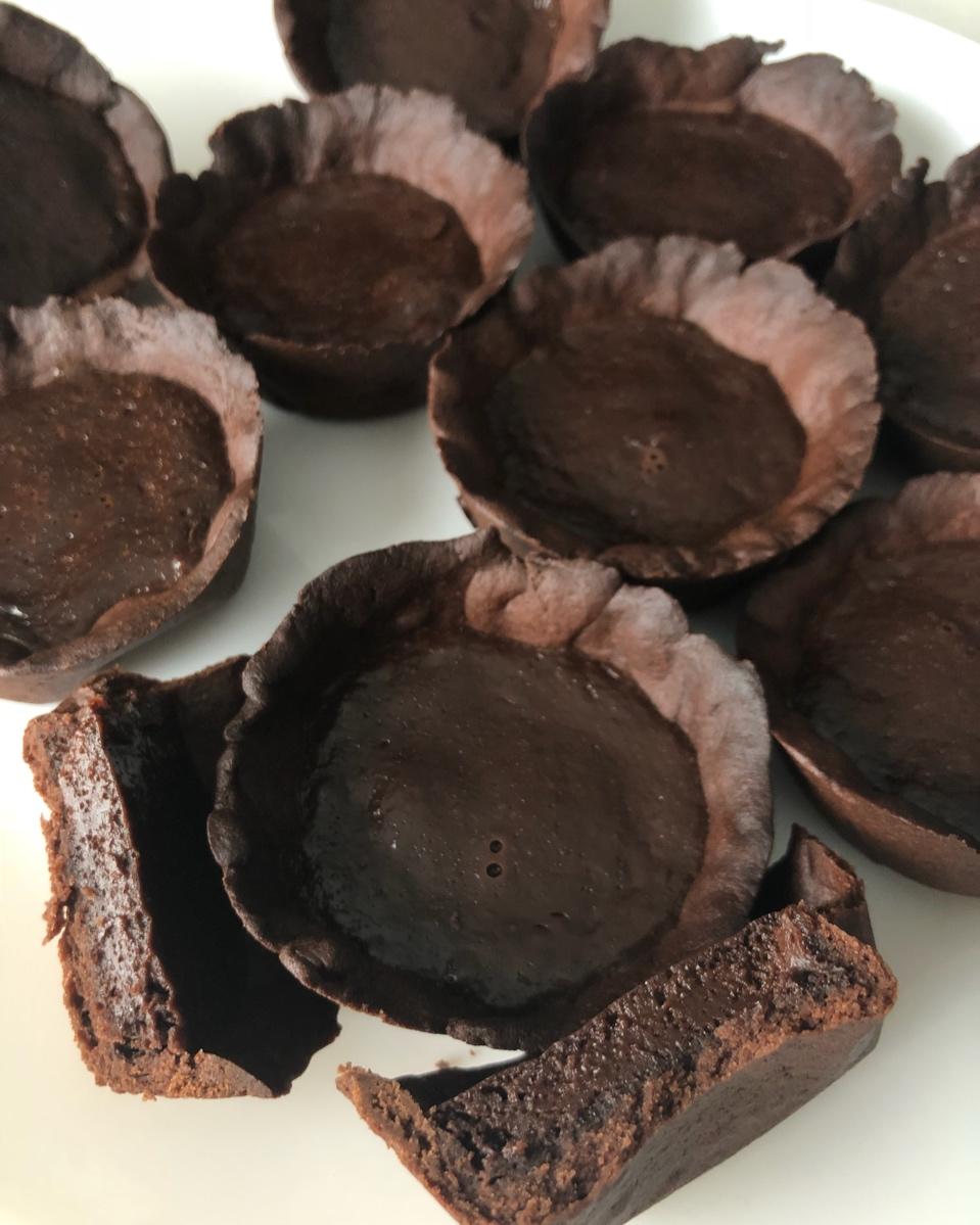 蛋挞液:75%黑巧36克,100%黑巧39克,糖45克,奶粉13克,水100克,鸡蛋液80克。