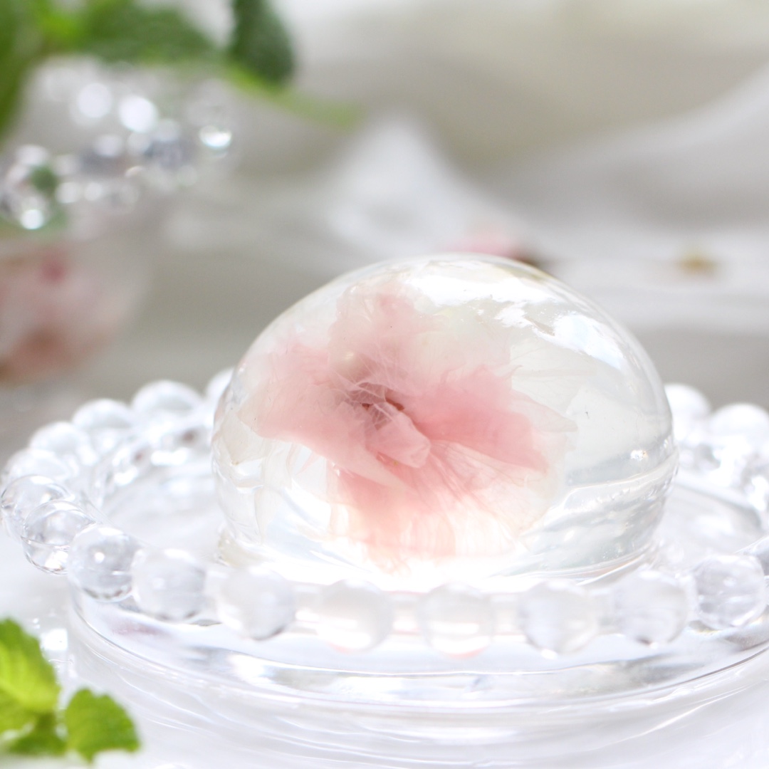 冰粉粉加入热水加适量糖搅拌均匀,倒入模具中,将泡好的盐渍樱花放...