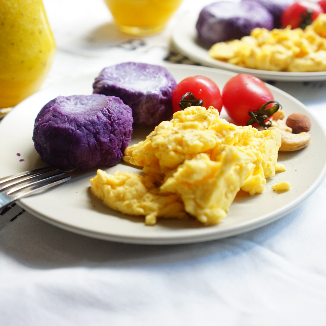 周末要认真吃~!鲜榨百香果橙汁、牛奶紫薯泥、港式嫩炒蛋!鸡蛋加入牛奶用黄油炒真的会更嫩更滑更香耶😋! #午餐•2016年...