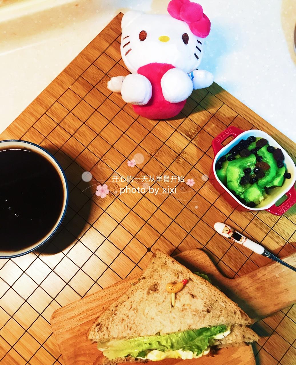 Day6💁🏻核桃杂粮鸡蛋三明治🍔配黑米粥🍵葡萄干蓝莓干小香瓜🥝