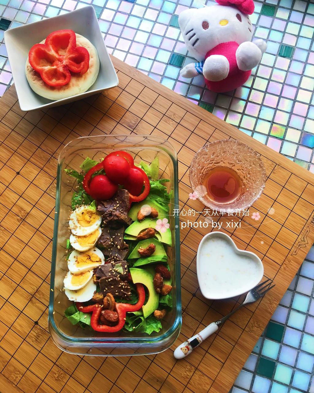 Day4💁🏻牛肉鸡蛋牛油果🥑坚果🌰芝麻红椒沙拉🥗配牛奶麦片🥛烧饼🥞