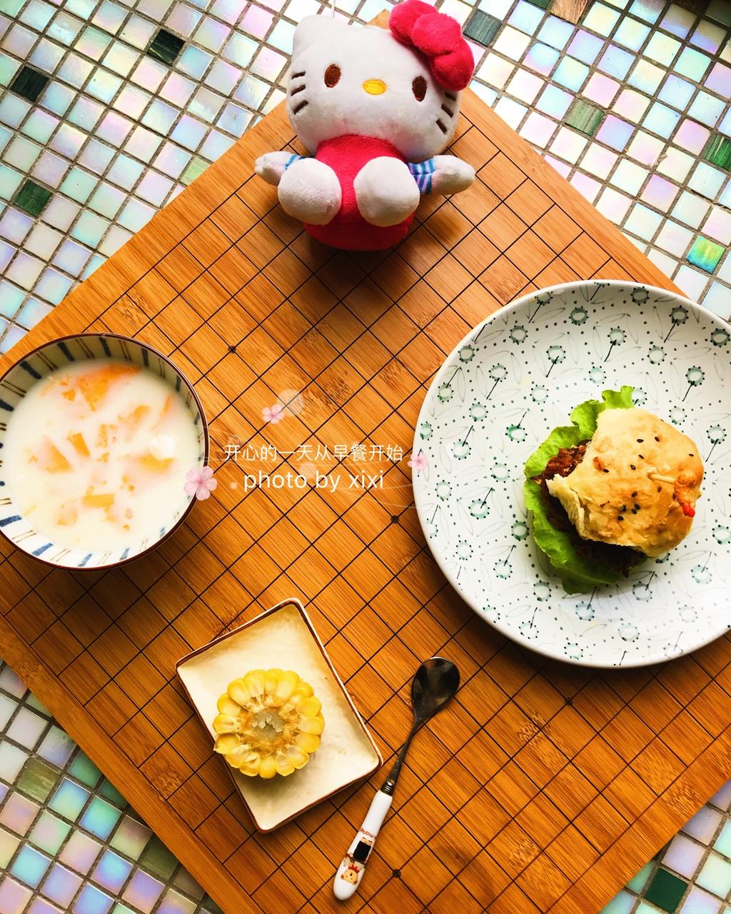 Day3💁🏻牛肉洋葱莲花白汉堡🍔配椰汁芒果西米露🍸玉米🌽