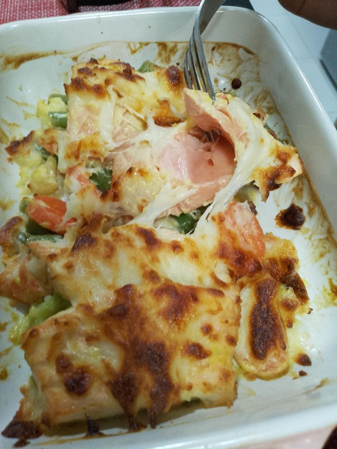 奶油芥末酱芝士烤三文鱼配杂蔬