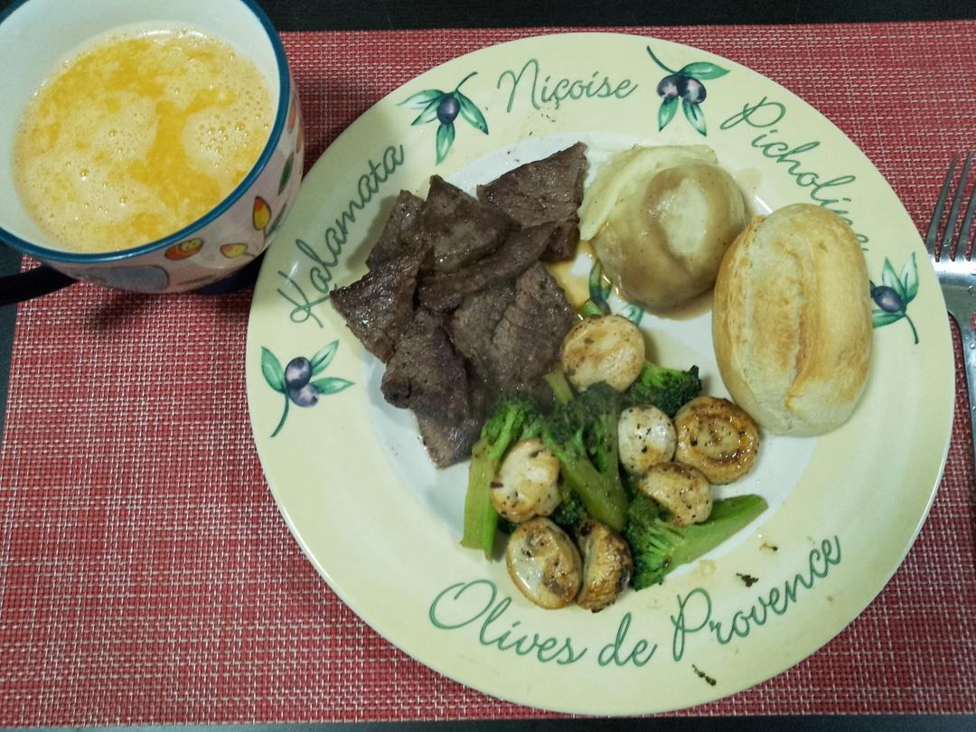 黑胡椒煎牛排配蔬菜和土豆泥