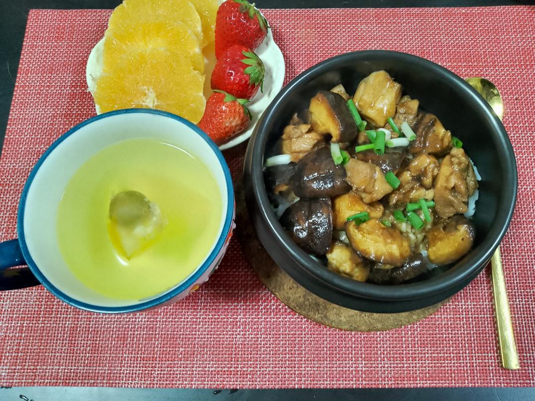 今天早餐吃香菇滑鸡煲仔饭