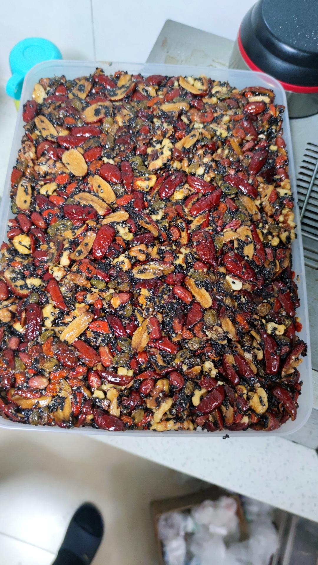 红枣120克,熟核桃仁180克,水50克,葵花籽油25克,生芝麻25克,麦芽糖白糖,晾晾中
