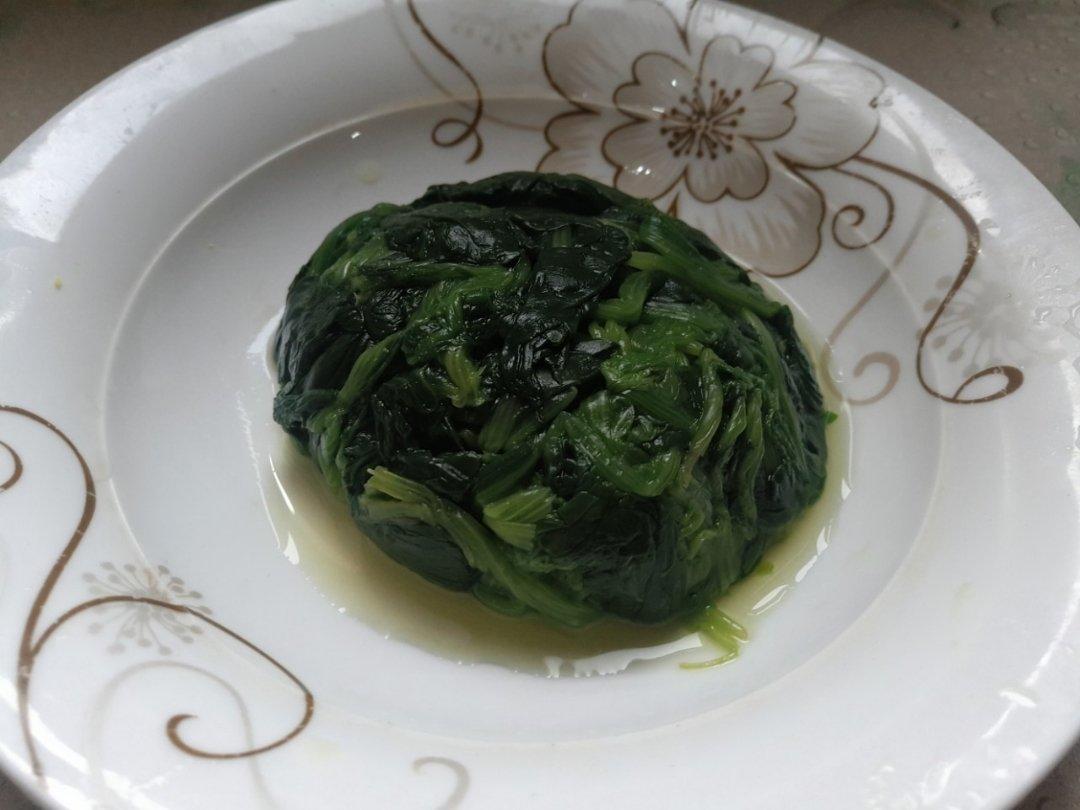 2.菠菜煮好后捞出,一定要用凉水沥干,用碗或模具并挤干多余...