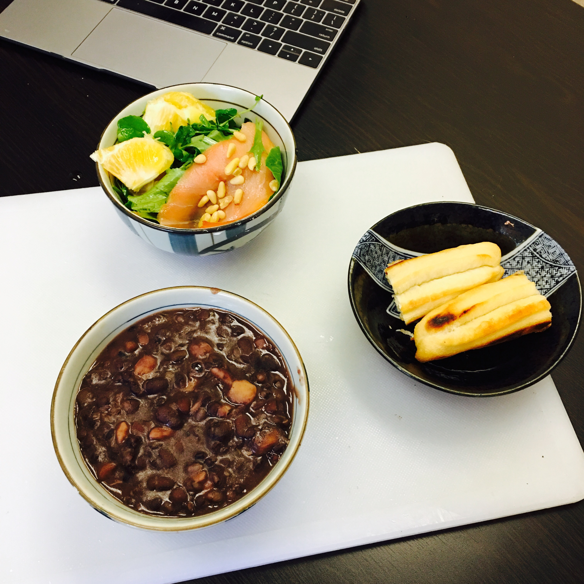Brunch了,西柚三文鱼色拉,红豆黑米粥,健康油条一根。