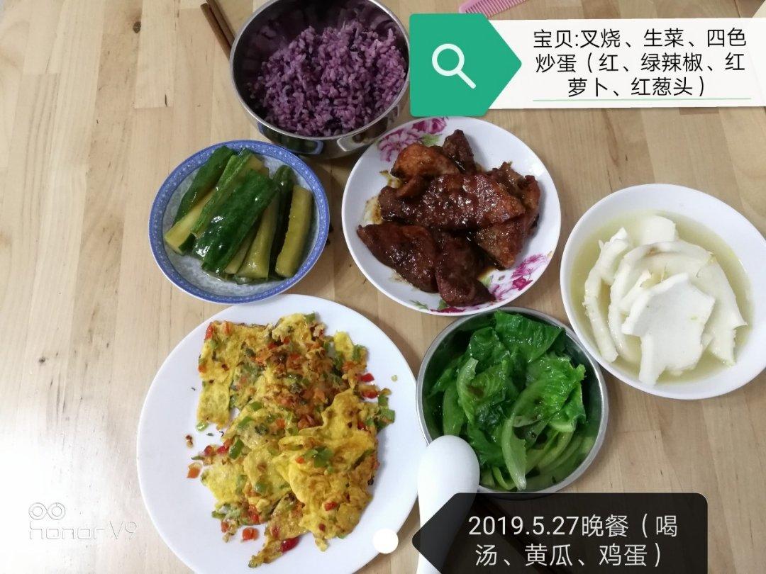 2019.5.27晚餐:自制叉烧酱猪排,四色蔬菜煎蛋🍳,给宝贝补充营养。