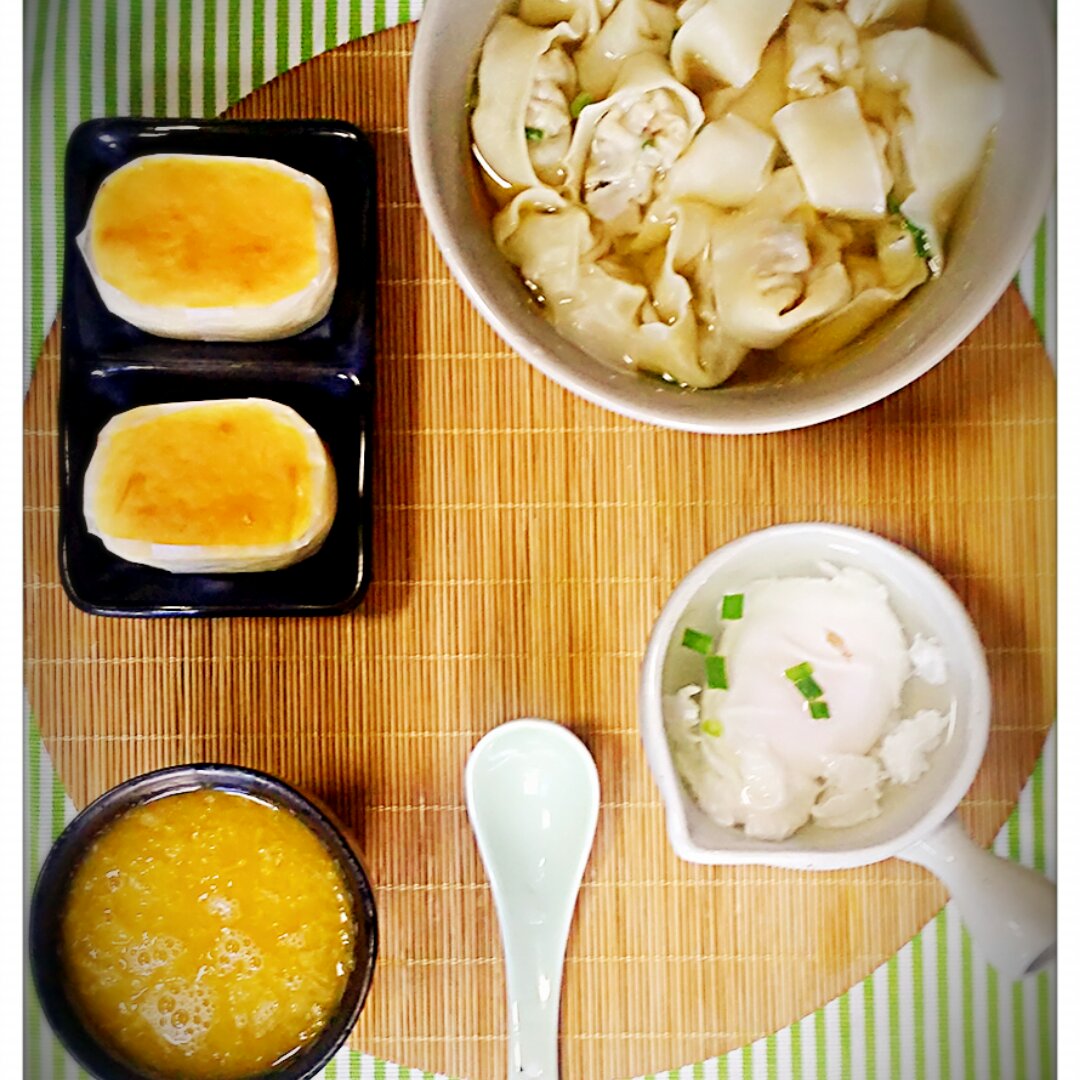 2016.3.15小羽早餐: 鲜肉小馄饨+水扑蛋+半熟芝士蛋糕+鲜橙汁。早上一见太阳各种洗...