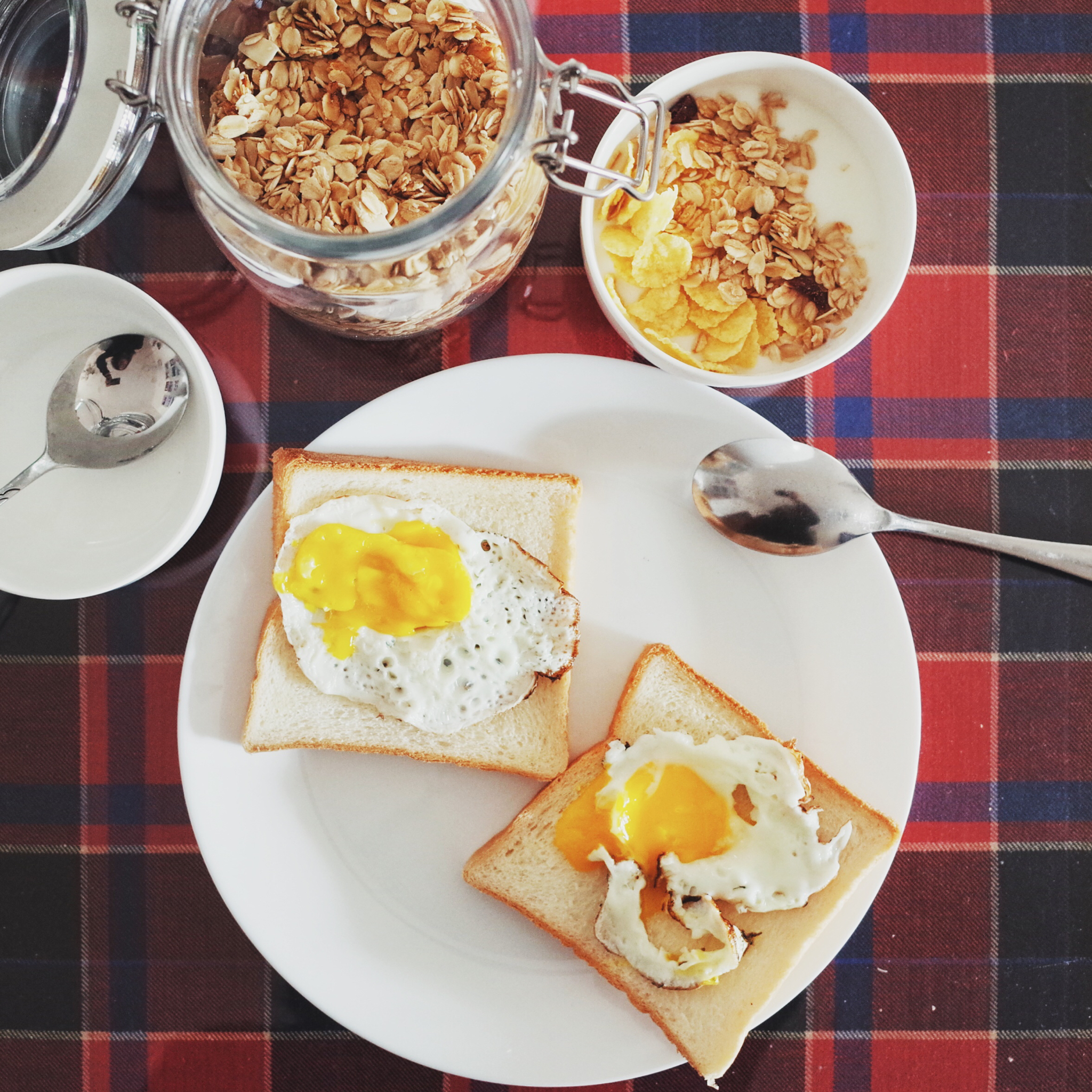 煎坏了的蛋和吐司和燕麦酸奶的早餐☀️