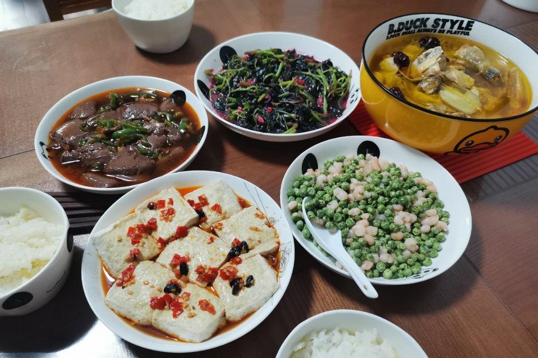 蒸剁椒臭豆腐 炒苋菜 青椒鸭血 豌豆虾仁 清蒸红枣枸杞草鸡汤