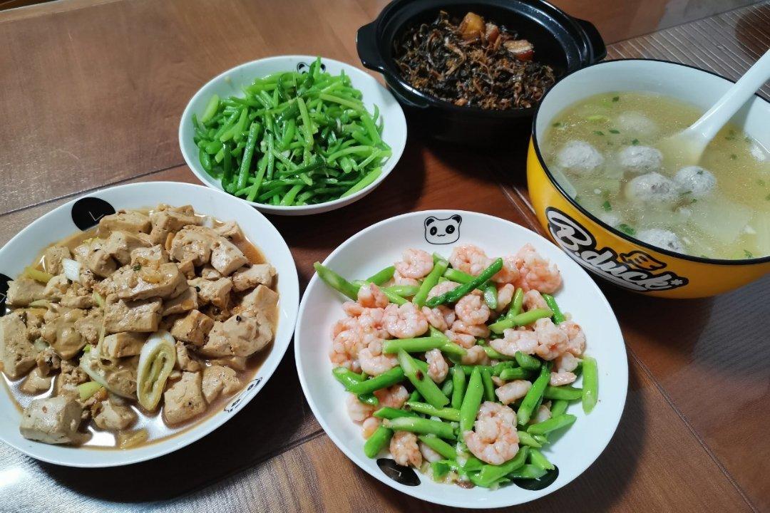 芦笋炒虾仁 红烧老豆腐 苋菜杠炒青椒 菜干烧肉 冬瓜肉丸汤