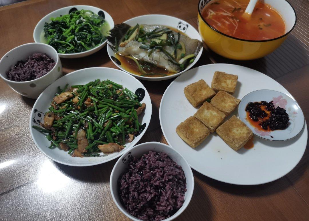 韭菜花炒回锅肉 清蒸鸦片鱼 炒苋菜 炸臭豆腐 番茄金针菇豆瓣...