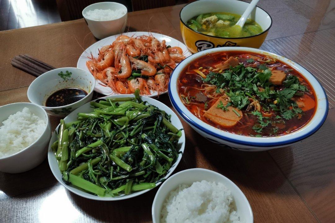 毛血旺 水煮台湾虾 清炒空心菜 剩鸡汤煮丝瓜