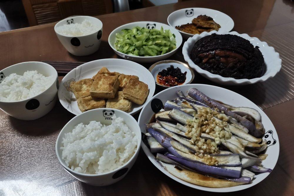 清蒸蒜泥茄子 炸臭豆腐 凉拌糖醋黄瓜 梅菜扣肉 煎猪排两块