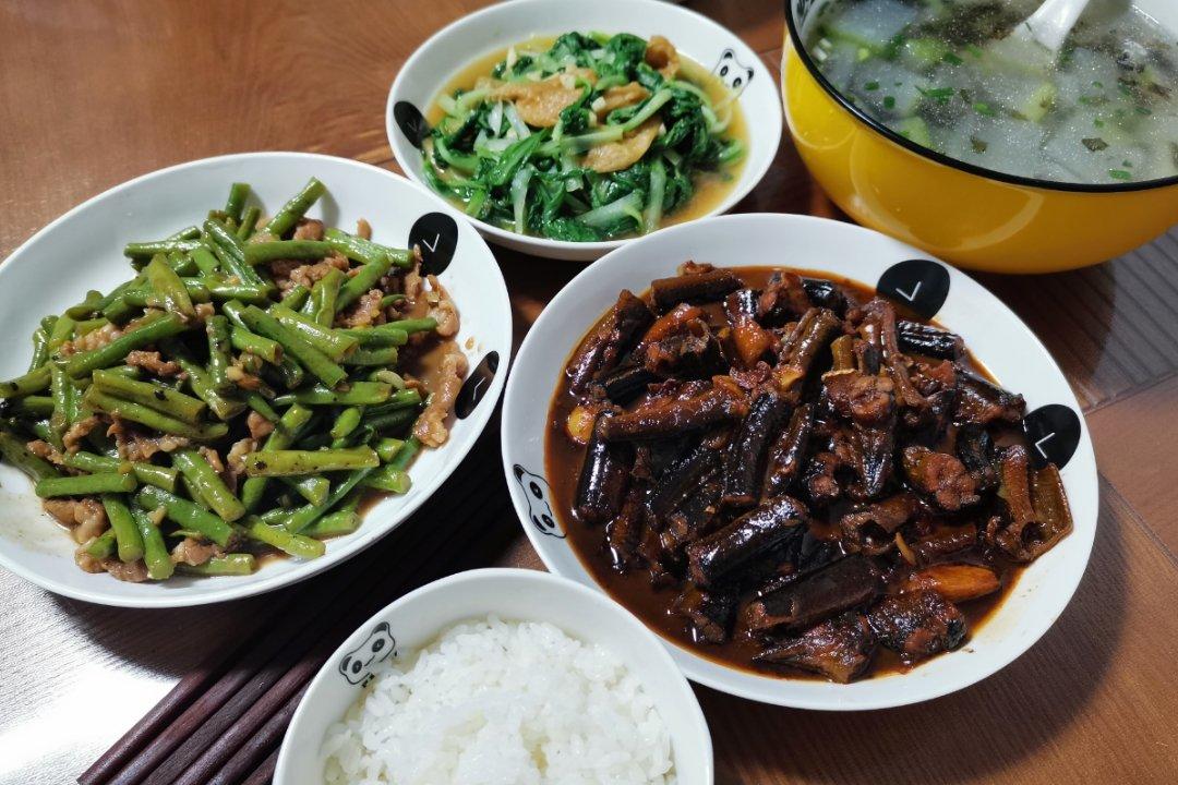 红烧鳝筒 豇豆炒肉 小白菜油面筋 冬瓜紫菜虾皮汤