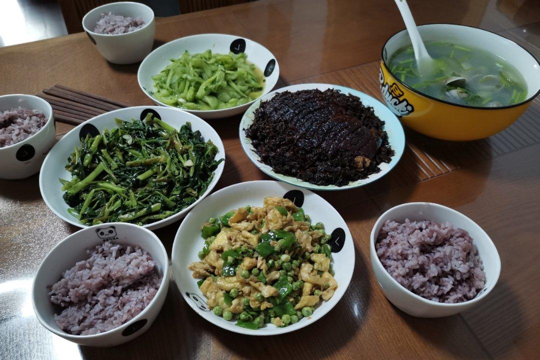 梅菜扣肉 清炒空心菜 青椒豌豆炒鸡蛋 凉拌糖醋黄瓜 丝瓜...