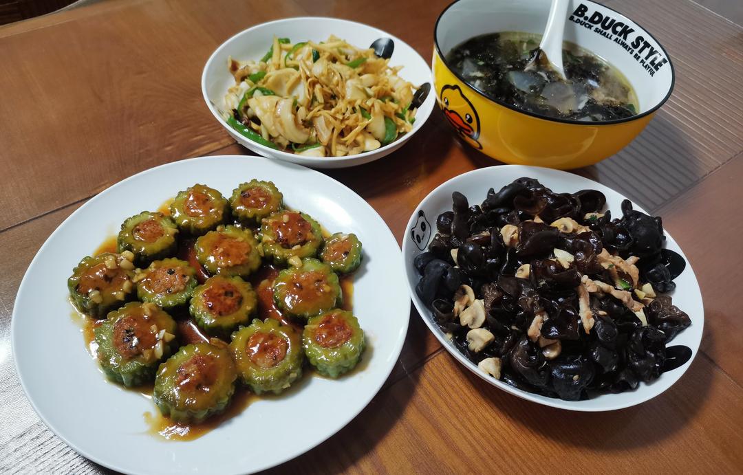 香菇肉沫酿苦瓜 木耳蘑菇炒肉 青椒茭白炒鱿鱼 冬瓜紫菜虾皮汤