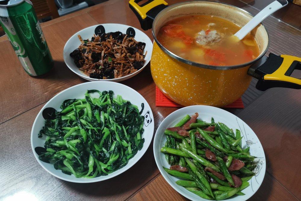 木耳黄花菜 芦笋炒腊肠 炒小青菜 番茄土豆筒骨汤