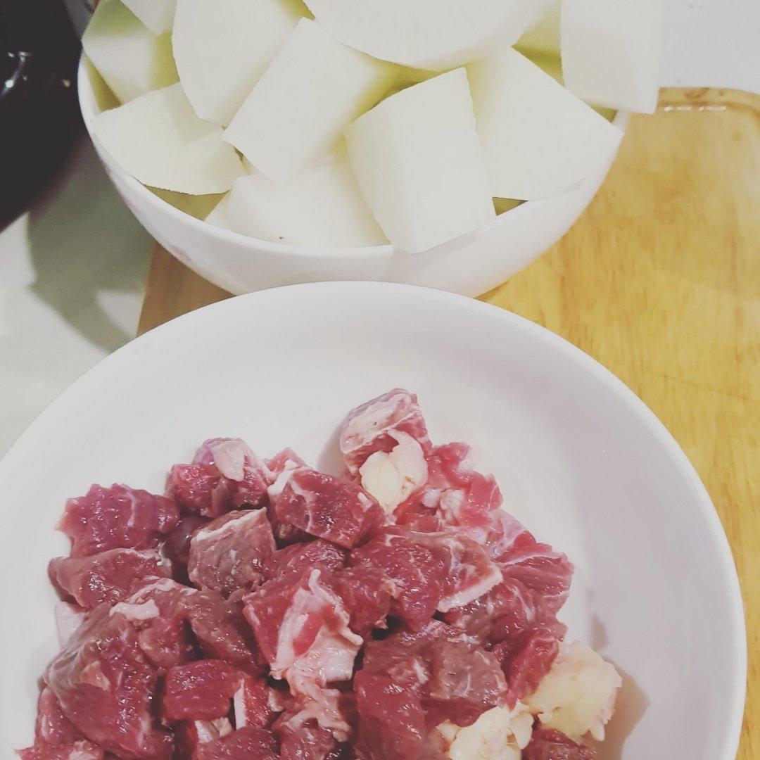 1.将牛肉切成粒,萝卜切成块。