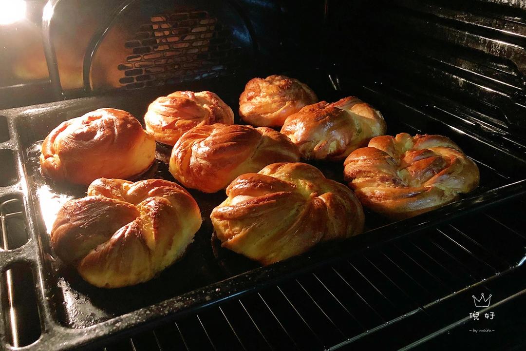 第一次做,面特别黏手,还好最后还是成了。表面酥脆超级好吃。最后的蛋液里加点黄油可能更亮。