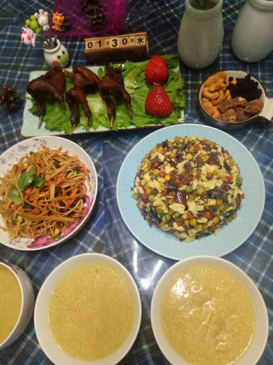 早上好!蛋炒饭搭配一碗红薯小米粥,炸了鹌鹑肉,拌了豆腐皮,坚果一份儿,营养足矣✌。