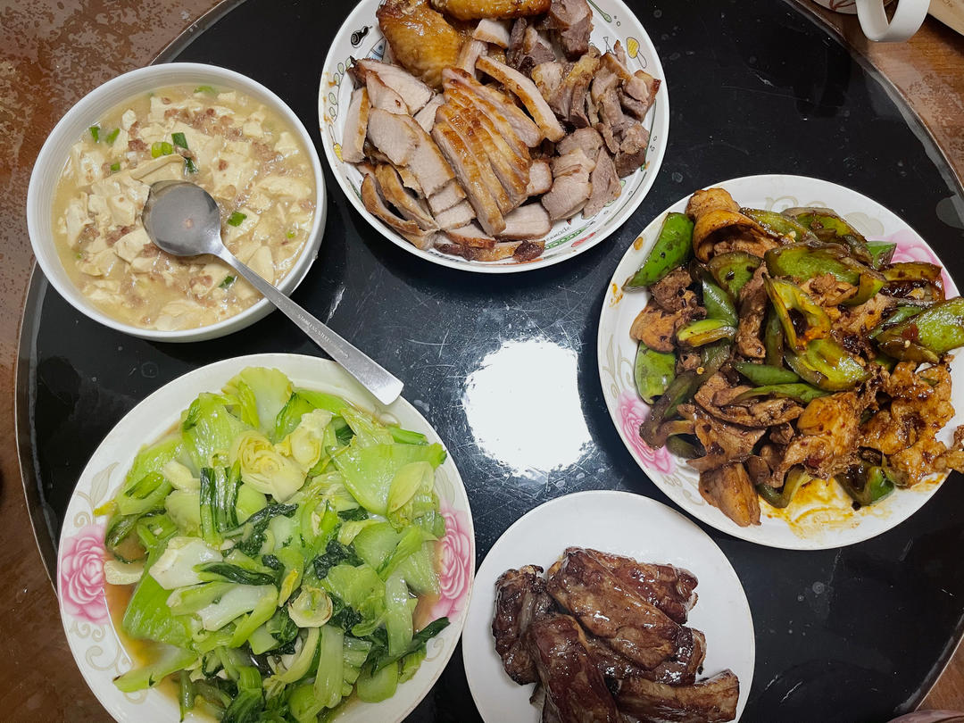 晚餐~我负责回锅肉、烧排骨…其他我妈做的,这样煮豆腐真的超级无敌好吃~今晚都是下饭菜 ……