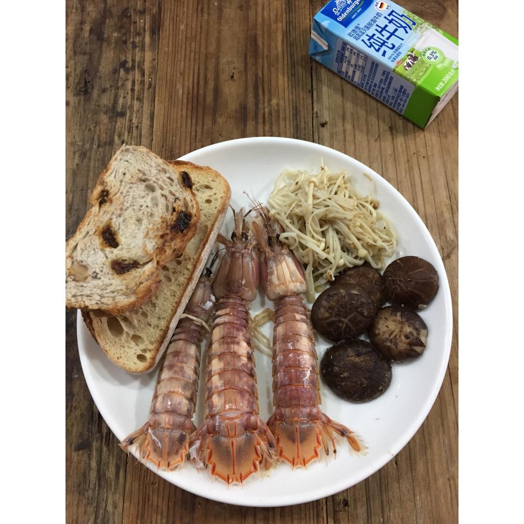 阿姿举个栗子、阿姿歪果仁、水煮虾爬、水煮香菇、无油煎金针菇、脱脂牛奶