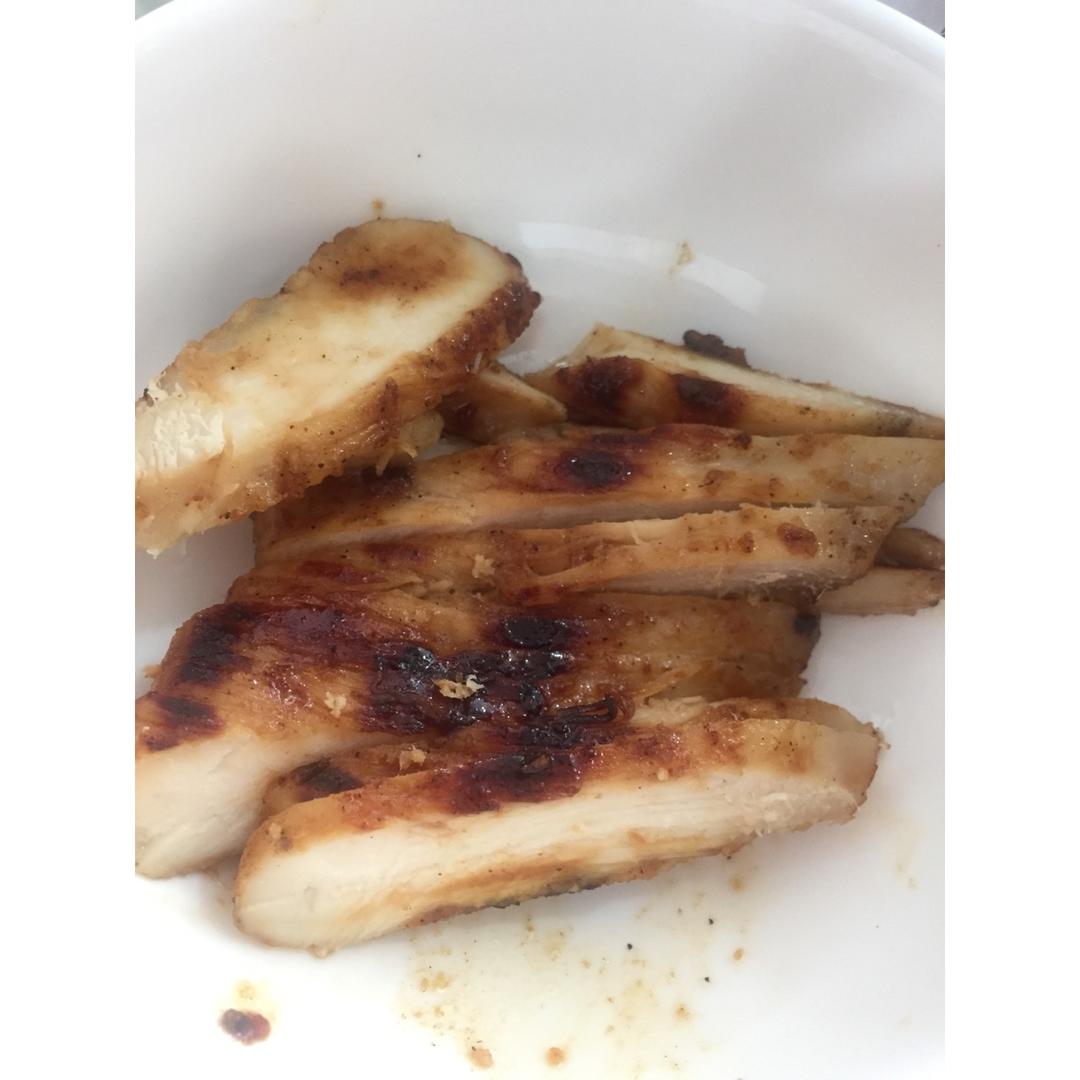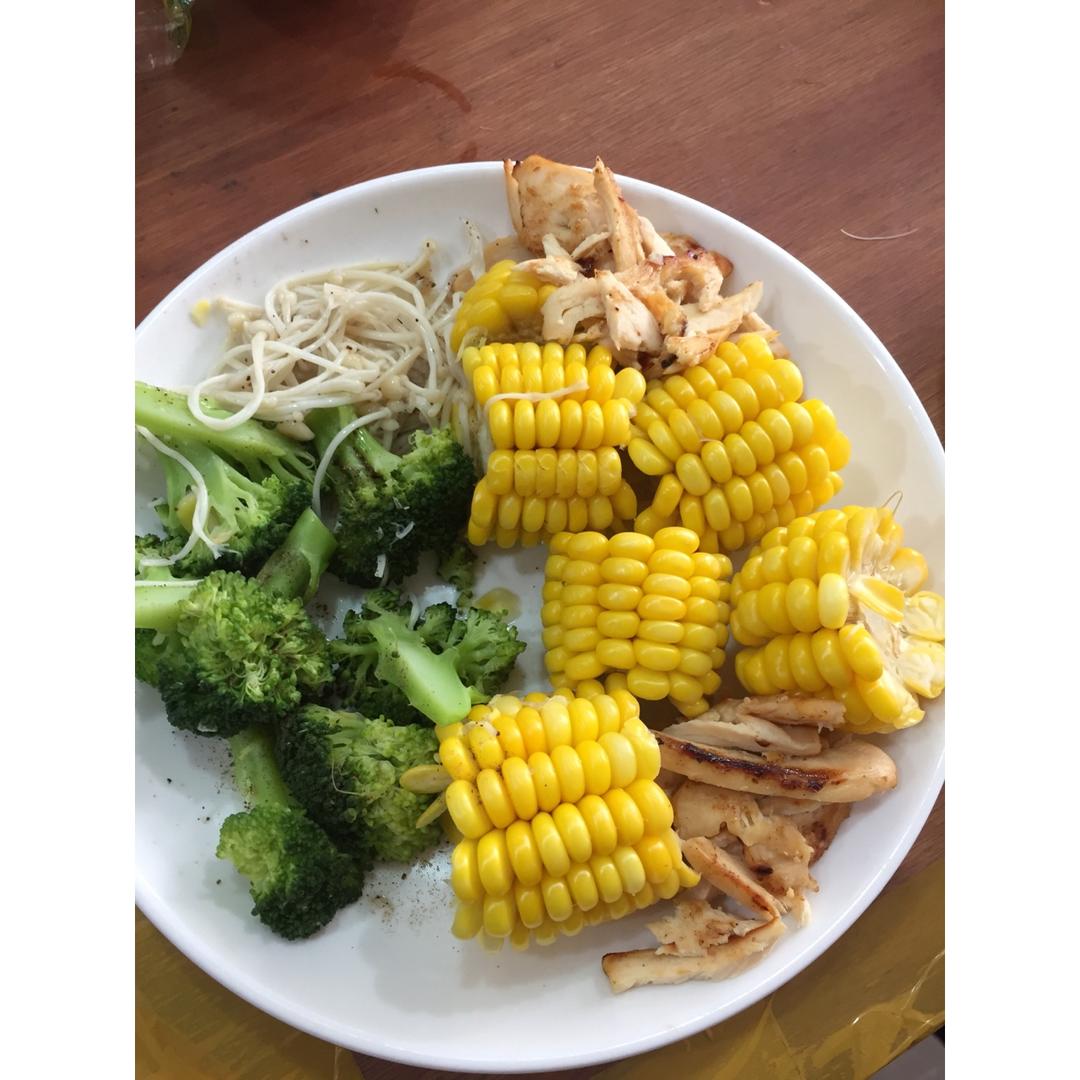 水煮兰花菜、金针菇、玉米、煎鸡胸肉
