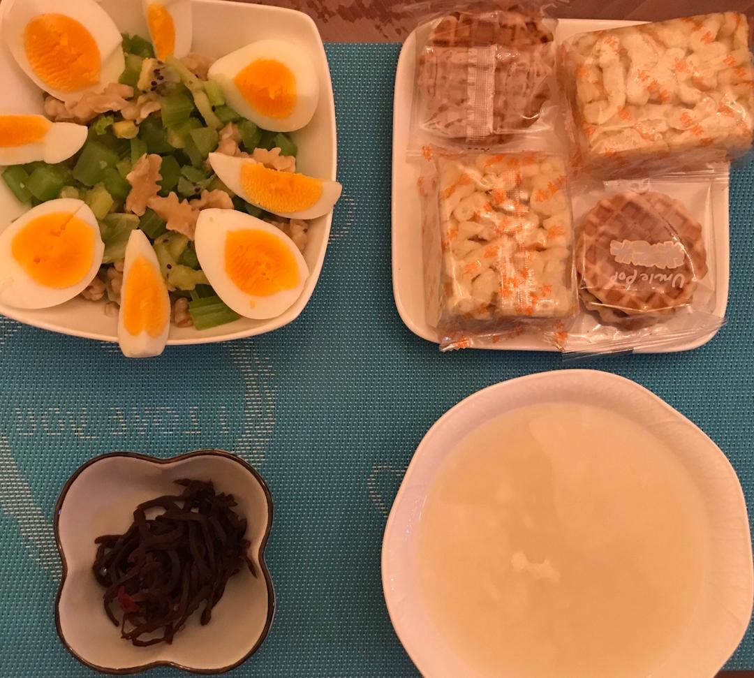今天外出开会一天,熬点粥喝,猕猴桃🥝买了没人吃,放在拌菜里,机智😄!