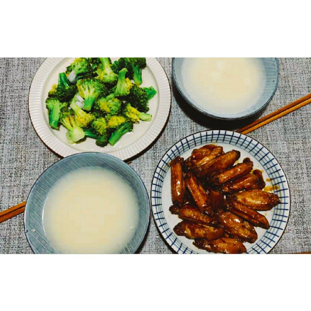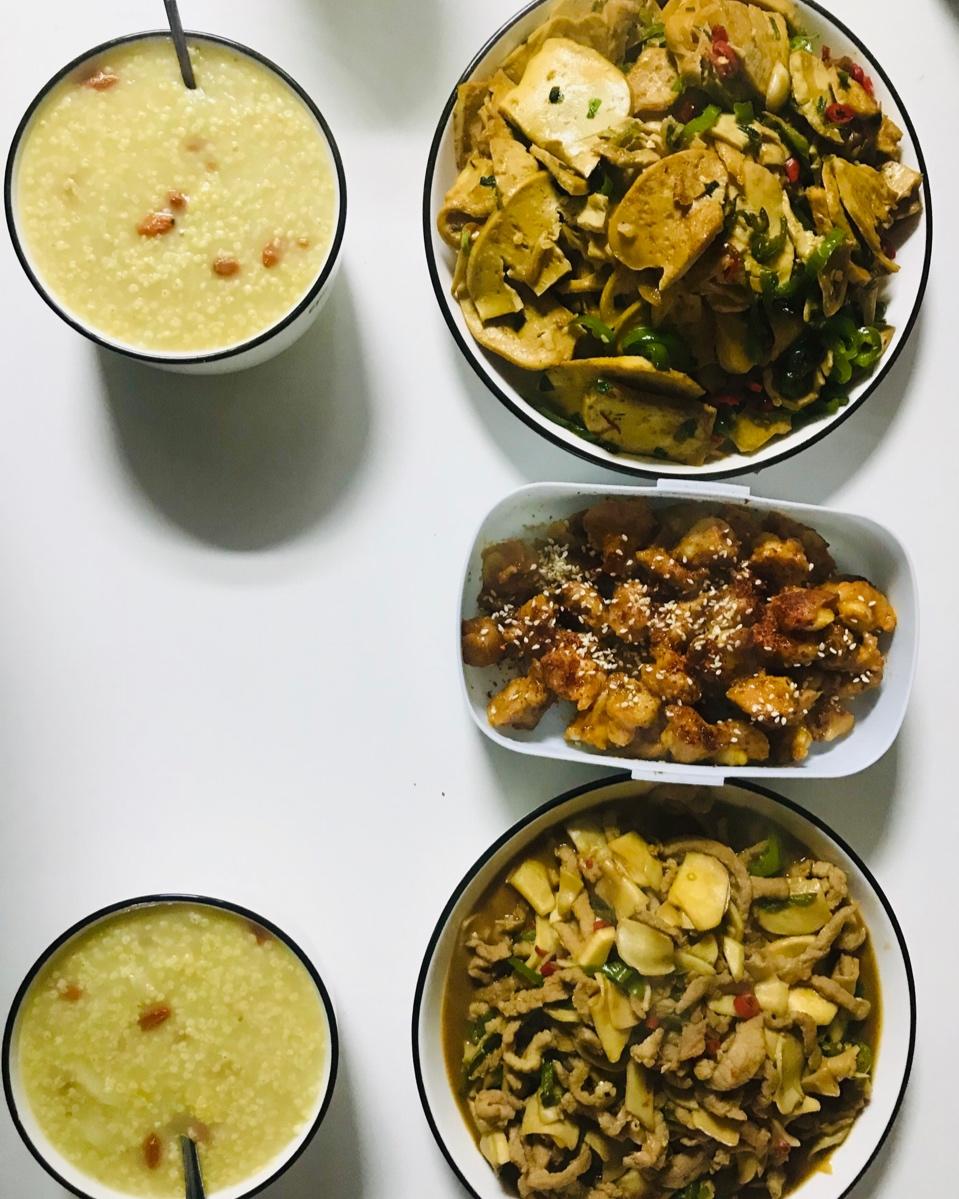 小米山药粥,青椒炒素鸡,孜然掌中宝,杏鲍菇炒肉丝