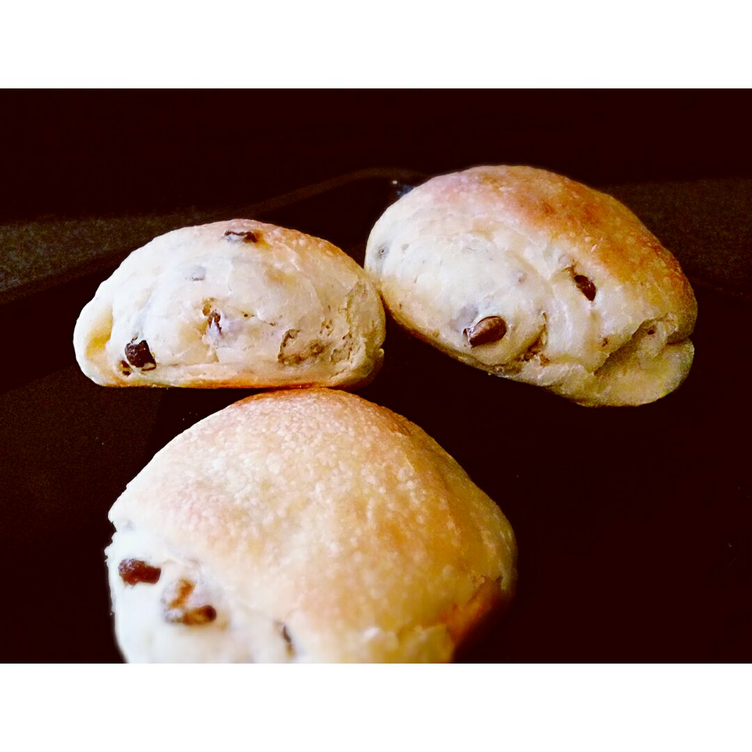 这是免揉,低温烘焙的。因豆沙馅稀了点,又放多了,所以没放冰箱二发...